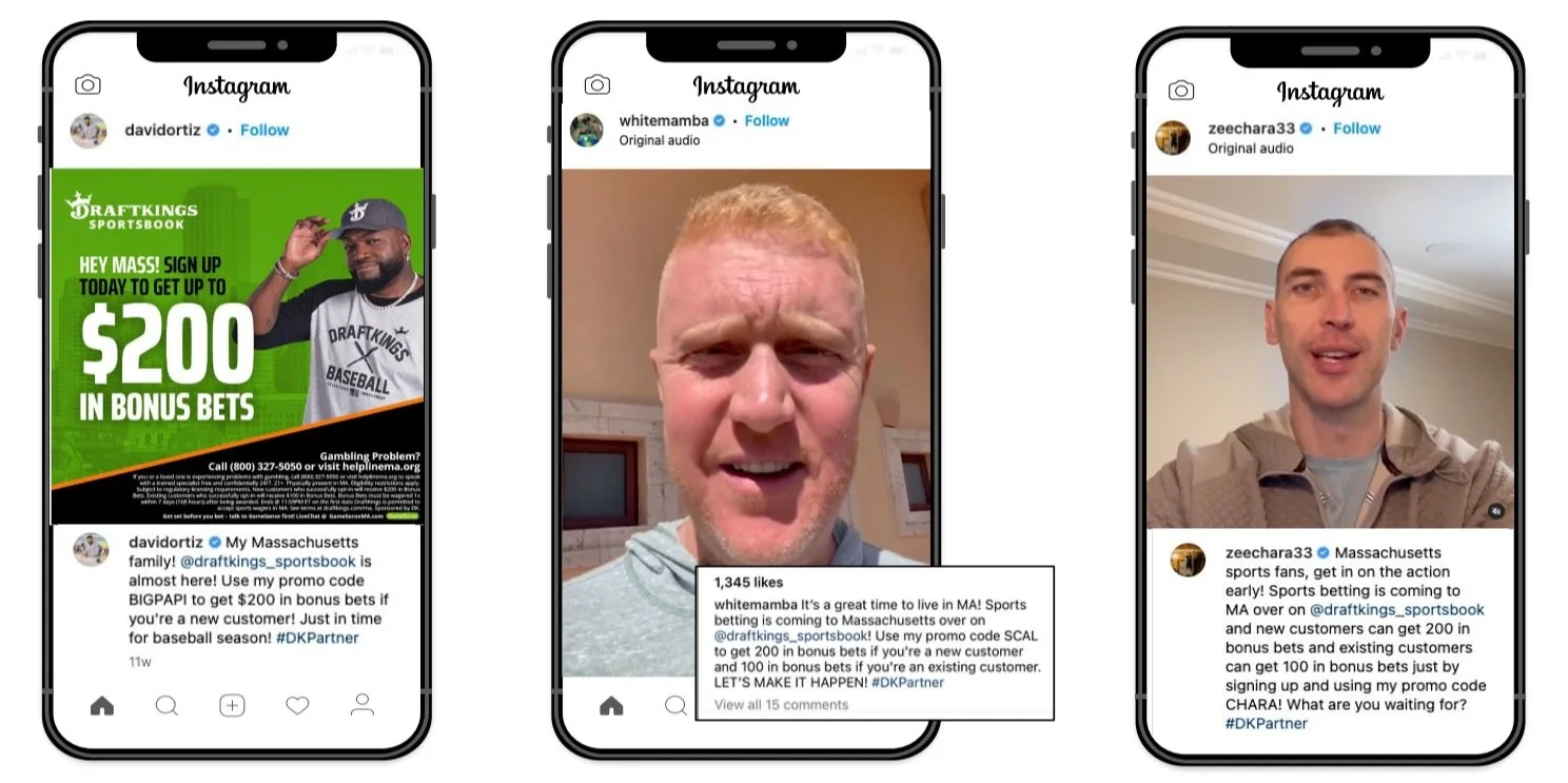 Leading up to the official launch, Draftkings signed local talent, Celtics legend Brian Scalabrine, Former Red Sox player David Ortiz, Boston comedian Lenny Clarke, Former Bruins player Zdeno Chara, and MA local Aly Raisman. Working with our content and socials team, I curated a social plan for each of them to post leading up to the official launch in MA. They all supported our new customer offer for the launch, filming videos and posting graphics. They all starred in the Draftkings “Bet local” commercial that was aired all over Massachusetts, and posted across their socials. My job was to write the legal-compliant captions and give them their posting schedules.