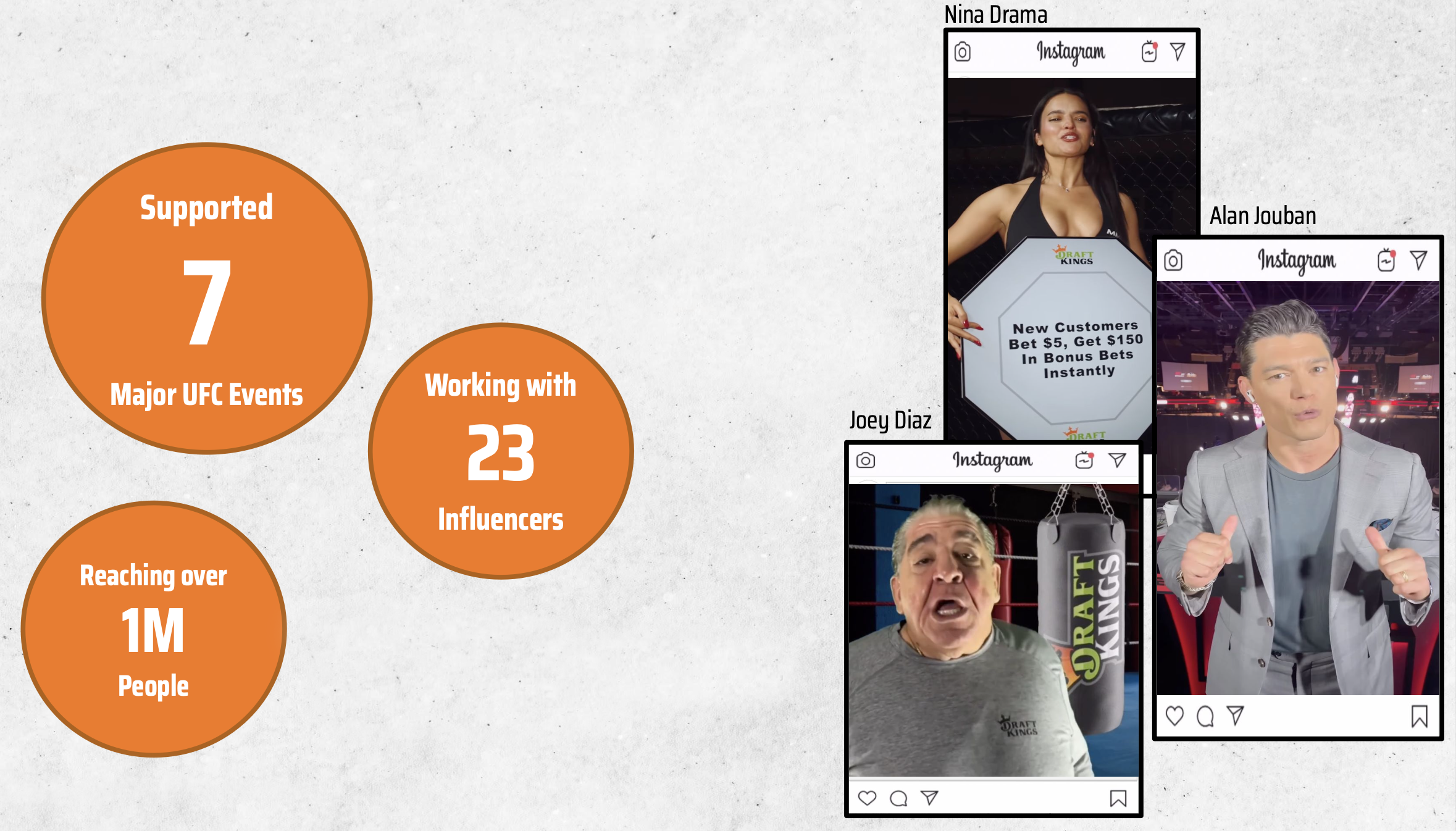 The Ask: Receive names from recruiting agency of influencers leading up to each fight. Write a brief with clear outlines for fighters to read in a promotional social video, make sure to include clear legal and timing guidelines. Once promotional videos are received, edit the videos, write captions unique to each fighter, and submit to DK legal team. Once tracked through legal, make any additional legal edits and send them back to the agency for posting.